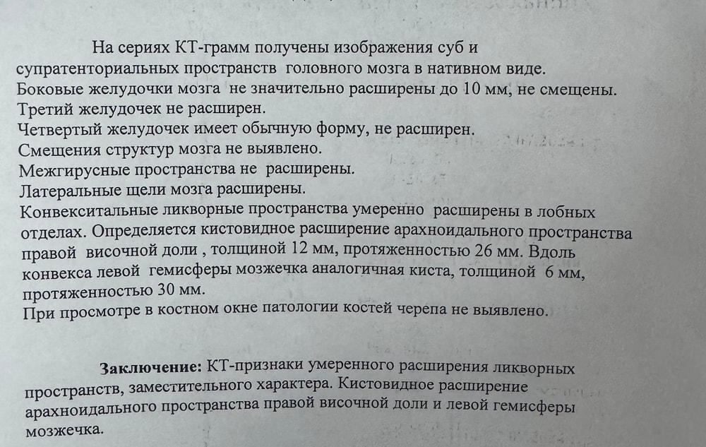 Лика, слушайте нейрохирурга. Но с генетикой идти к генетику и сдают генетические анализы. Так по кт ничего генетического и ничего критичного. Расширение ликворных пространств- сейчас у каждого второго. Не гидроцефалия, не на столько расширены. А касты- случайная находка.