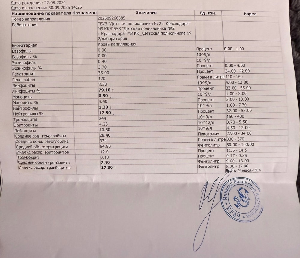 3. Изменения в лейкоцитарной формуле (высокие лимфоциты и низкие нейтрофилы) являются классическим проявлением "детского" варианта крови (физиологический лимфоцитоз) и не должны вызывать беспокойства.