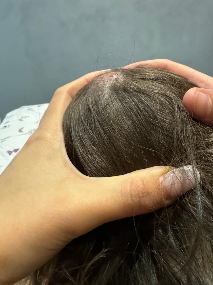 Место конечно не характерное. Но вот я когда увидела сразу на герпес подумала. Очень прямо высыпания похожи. Всяко может быть. Может у ребенка там ранка была, а кто то поцеловал в макушку, иммунитет ещё не зрелый, а пузырьки лопаются, и происходит самозаражение. Попробуйте сдать соскоб на герпесы.
