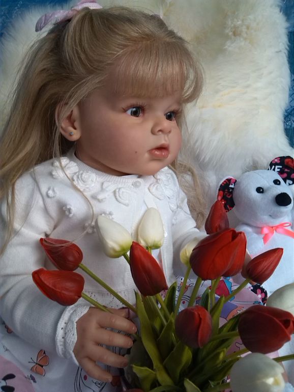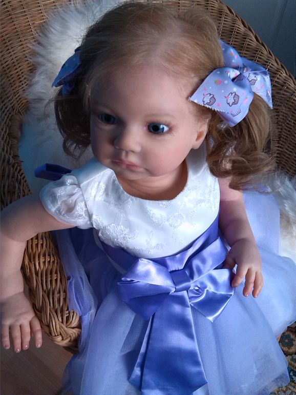 Девочка возрождена из молда мелодия ,скульптор Андри Стоетти ,глаза карии ,стекло Лауша (германия ),ресницы и волосы натуральные(прошиты по одному) ,расписана генезис ,методом послойного запекания множества тонюсеньких слоев ,закреплена медиумами.Рост 52 см ,вес 2300 г.Очень уютная в руках.Малышке нужна заботливая мамочка.