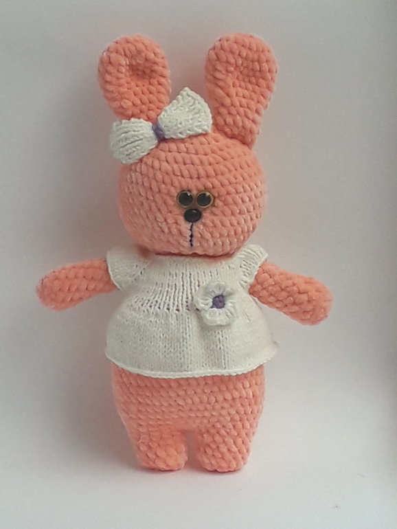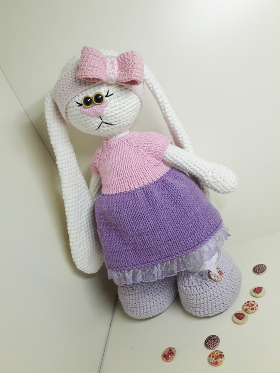 Она может сидеть с опорой. Платье и туфельки снимаются. С ней в комплекте идет ее маленький друг - зайчик.