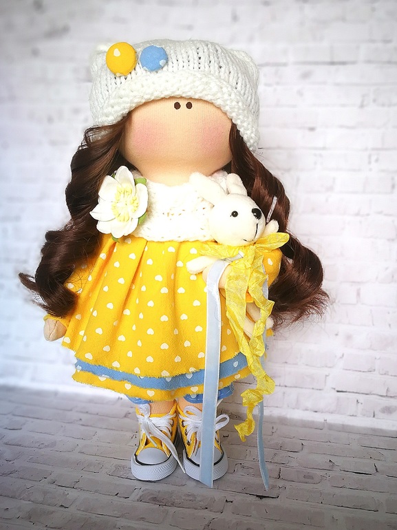 Кукла текстильная, ростом 19 см, с густой копной волос! Приедет к вам в подарочной упаковке. Вся одежда съемная! Штанишки, туника, ботиночки, бант, рюкзачок - все можно снять!