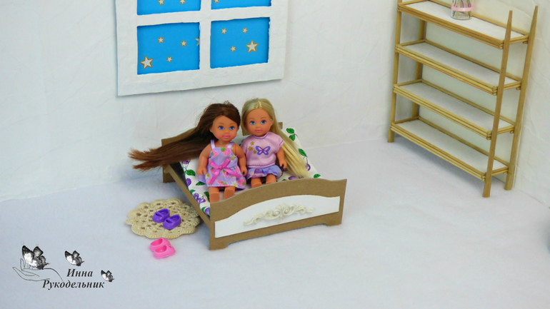 Для куколки Эви сделала кровать. Это изделия замечательно подойдет для фото и мультиков с куклами.Такую кровать можно сделать для разных кукол, только нужно подбирать размеры заготовок.
