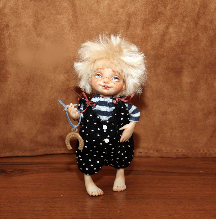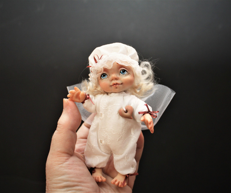 куколка на каркасе размером , голова, ручки.ножки- запекаемый пластик, все сгибается,волосы-натуральная шерсть ангорской козочки, роспись акрил, пастель, ручки,ножки. голова-подвижные))