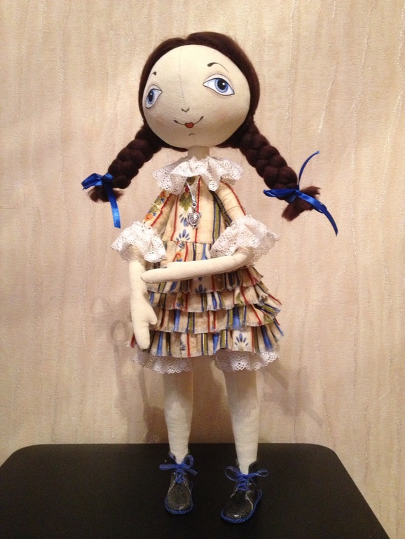 Великолепный мастер Светлана показала, как она делает своих куколок. Вот и я попробовала. Результатом очень сама довольна! А главное дело для души нашла! :) Сшита из тонированной бязи, роспись лица акрилом и пастелью, платье американский хлопок и кружева, ботиночки из натуральной кожи. Стоит самостоятельно. Рост 38 см.