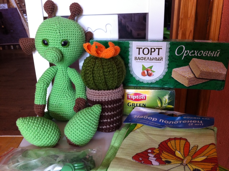 Надя,ты мастерица! Кактус буду использовать как игольницу. А еще в посылочке был чай,конечно зеленый, тортик, машинки детям (одна до фотки не дожила,уехала на парковку старшего))) И полотенчики на кухню, и хомочкины запасики.