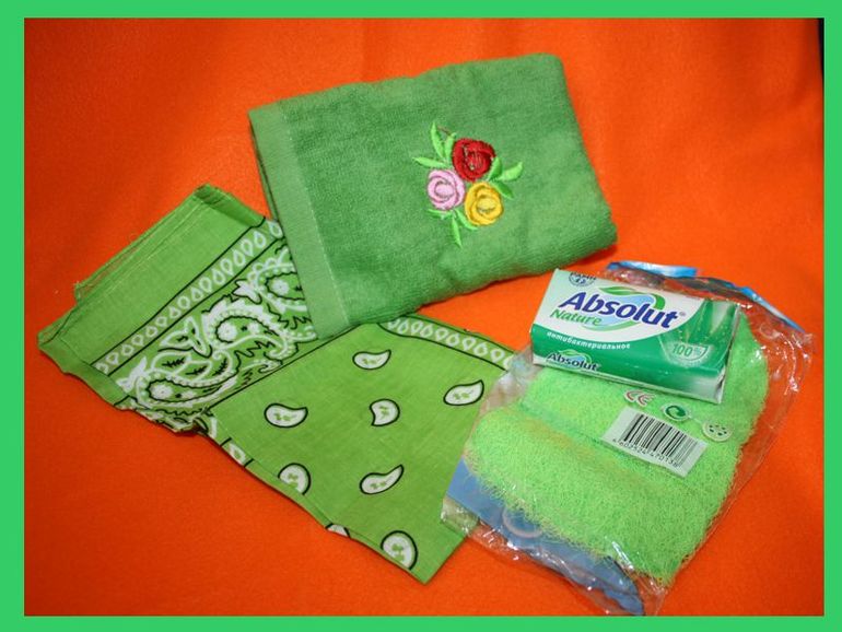 в следующем пакетике было: полотенчико очень мягкое, ароматное мыльце, мочалочка и бандана!!!