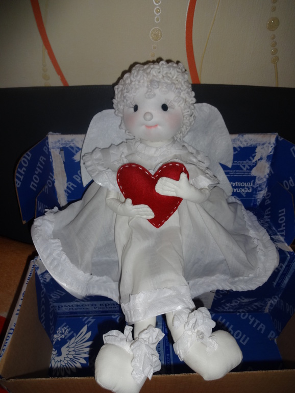 Ой, я в своей повседневной суете совсем забыла про эту посылку. Вот сегодня вспомнила, заглянула — а она уже давно получена!Рада, что понравился мой ангелок. Надеюсь, не очень помялся в пути. У него петля есть на спинке и его можно куда то вверх, даже на люстру повесить, и он как то сверху вниз прямо будет смотреть.