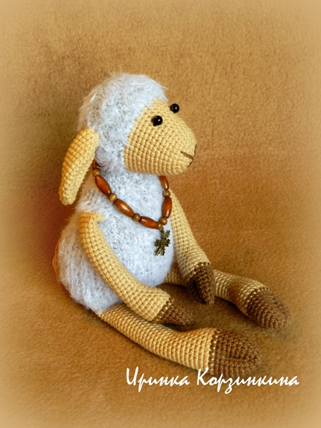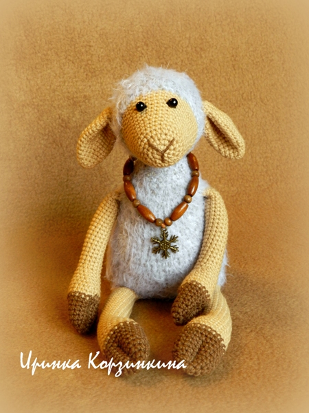 Овечка цельновязаная, пришиты только голова и ушки. Игрушка уверенно сидит без опоры. Лапки подвижные.