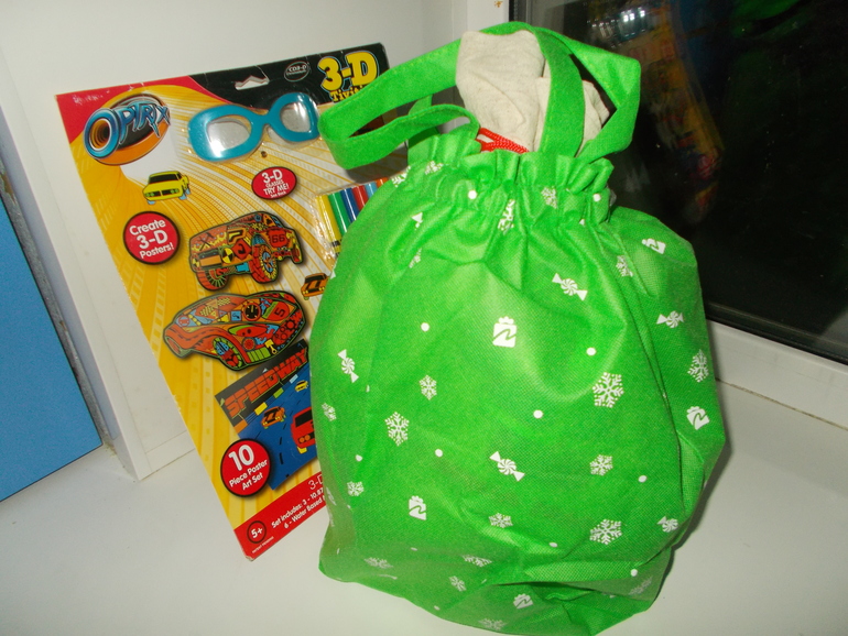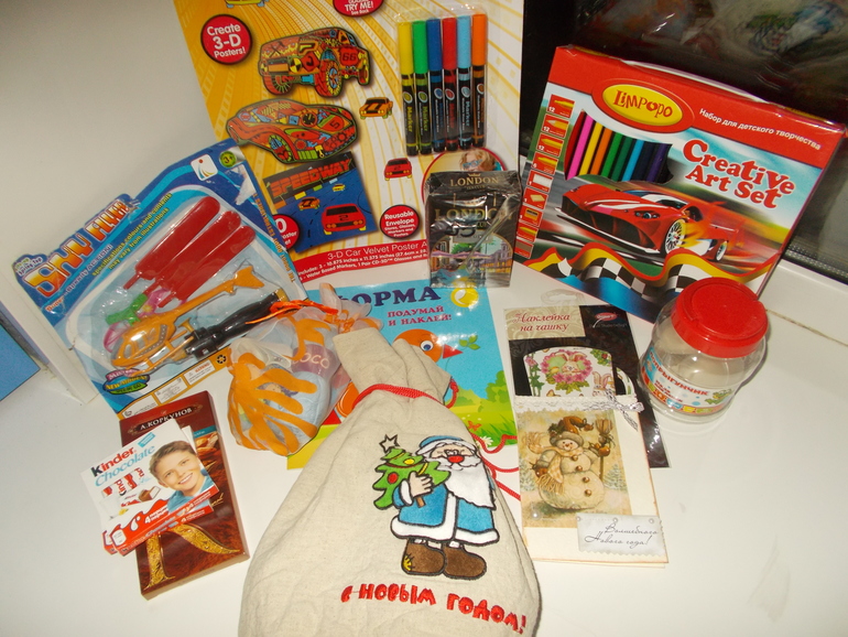 ВСе подарочки были спрятаны в новогодний мешочек) , только 3-д машинки не поместились