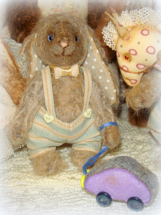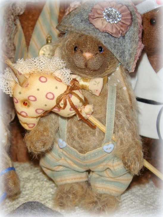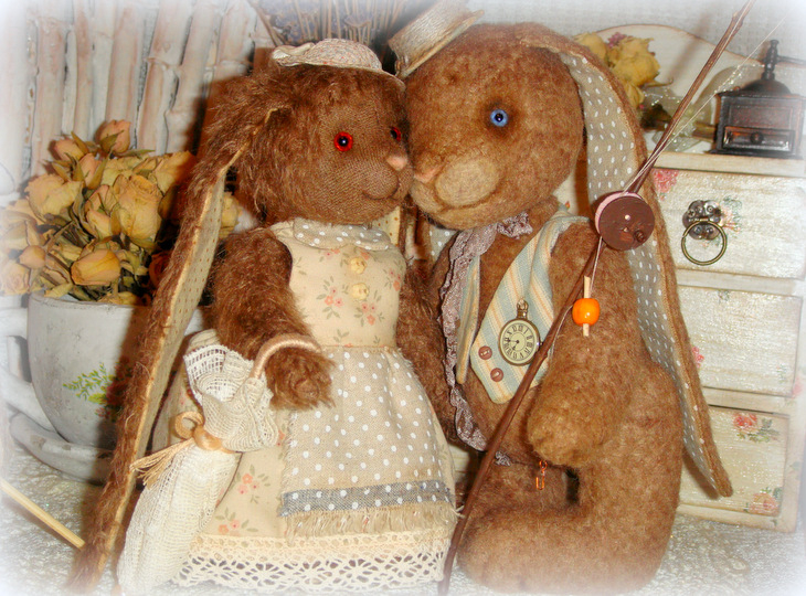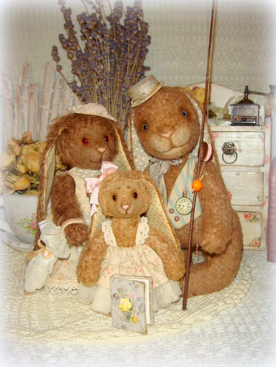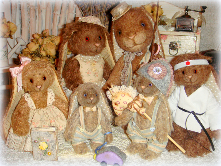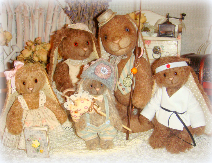 Все зайки сшиты с учетом цвета волос, глаз и увлечений прототипов)) Да! Зайцы портретные! Сшиты из мохера, льна и хлопка, набиты опилочками и гранулятом, глазки-стекло, по 6 шплинтов в каждом зайце, состарены маслом.