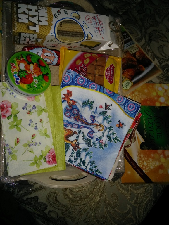 Очень много подарочков для моего хомячка, огромное спасибо за подносик!!! Теперь надо решиться и сделать его =)) А еще большое "сибо" от сына, дед мороз и сок были уничтожены сразу ;) Коробку с конфетками отняла с боем, хотела на новый год, но он ее уже всю раскрыл =)