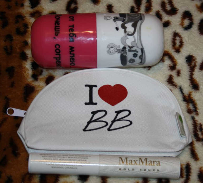 стаканчики, косметичка (обратите внимание на надпись) и духи