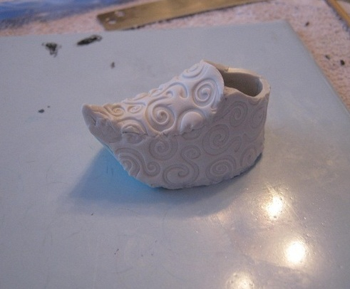 Начинаем состыковывать детали от носа башмака, слегка его приподнимая и загибая наверх. Палочкой или стеком придавливаем к подошве.Формируем пятку и верхнюю часть башмачка. Еще раз все проверяем - все стыки заглаживаем.