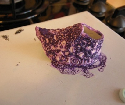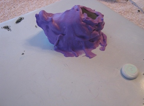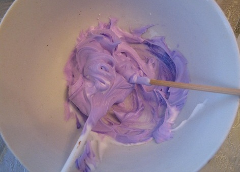 Теперь смешаем немного пены для бритья и акриловой краски. Я брала фиолетовую. Пока пена не «сдулась», быстро наносим густенько на башмак. Можно взять и мусс для укладки волос, эмпирическим путем установлено, что он более воздушный, чем пена, и мусс быстрее оседает.(можно сделать тон и после запекания-мне нравятся пузырьки от пены после выпечки)