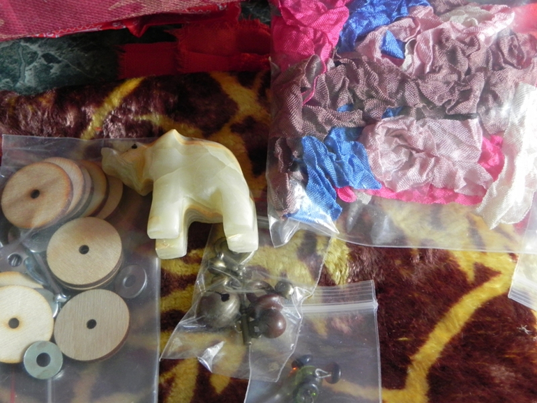 А там плюш советских времен!!!!!!!!! Шплинты, диски, глазки, подвесочки и шебби-лента!!!! А еще слоник из оникса и коробочка!!! Натик, я так запищала, что сына испугала