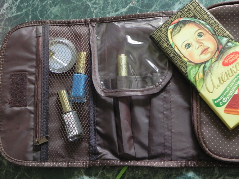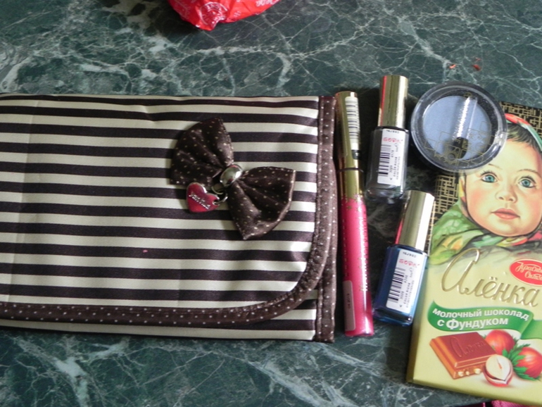 Дальше дочкины сокровища. Очень удобная косметичка, лак для ногтей, блеск для губ, тени и любимый шоколад