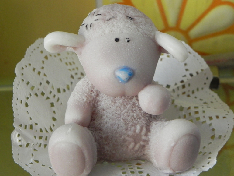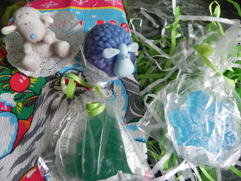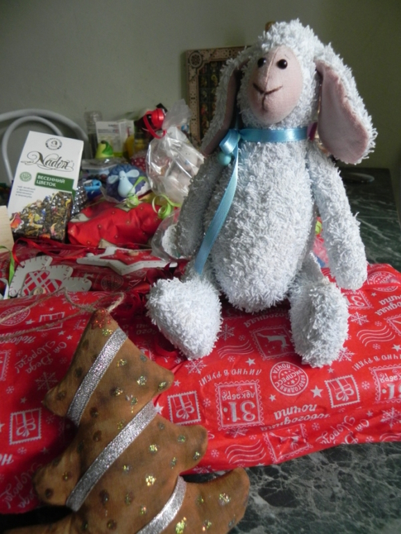 А напоследок самое сладкое!!! Овечка. Дочь очень равнодушна к мягким игрушкам, а эту сразу утащила к себе, сказала, что никому не отдаст. Даже не послушала, что он голубая и с пустышкой. Так-то, говорит, она для Сергея, но все равно не отдам))) А елочка какая ароматная!!!