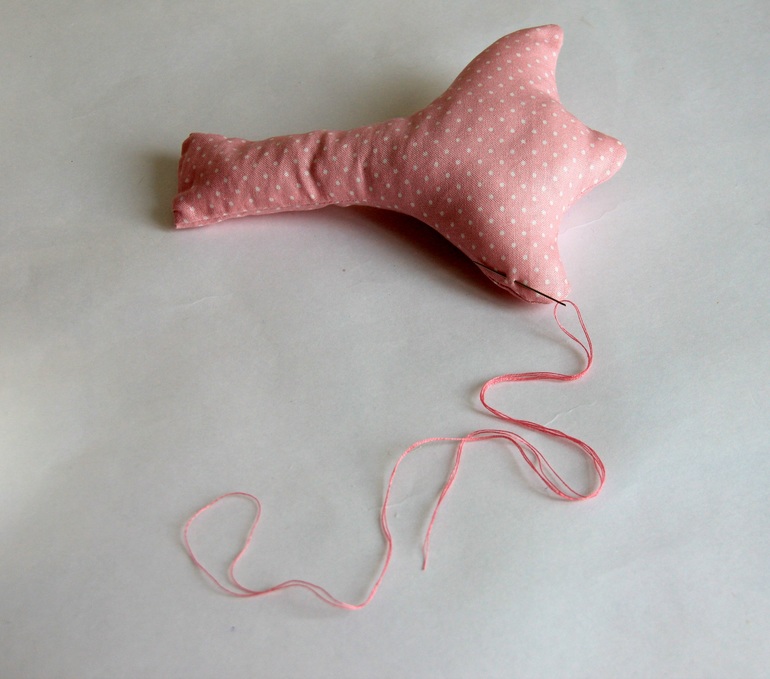В конце со стороны пятки завязываем аккуратный узелок, конец нитки прячем вглубь лапы, вытягиваем; надо чуть потянуть ниточку и обрезать вплотную к ткани, чтобы ничего не торчало.