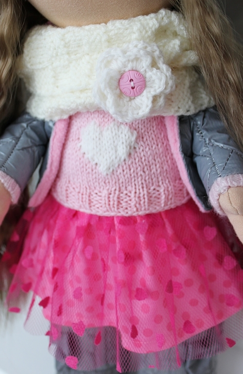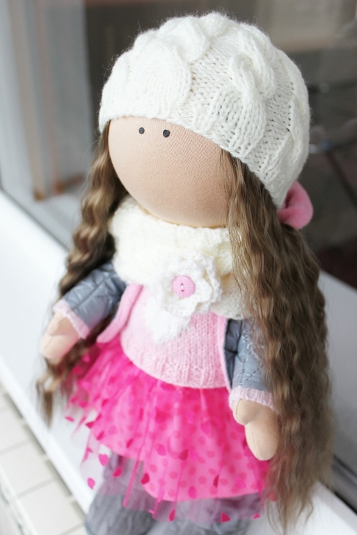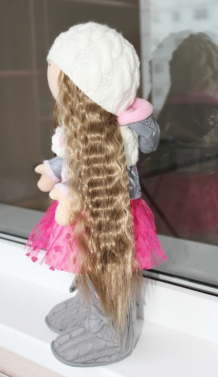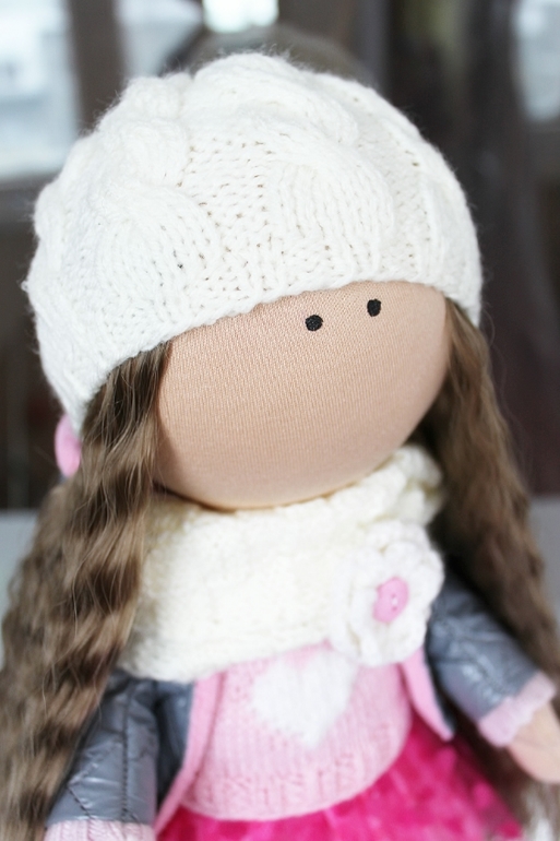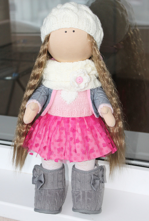 Текстильные куклы (кроме вальдорфских)Текстильная кукла ростом 40 см. У нас на севере зима в самом разгаре, поэтому девочка одета тепло: вязаный свитерок, угги и шапка с шарфиком согреют ее в холодную погоду.