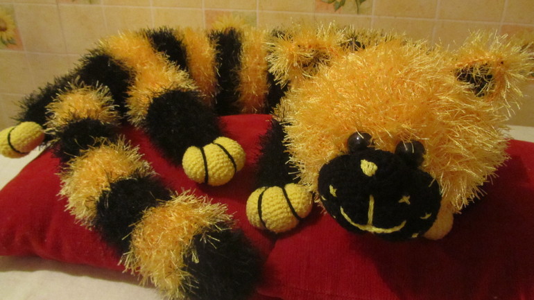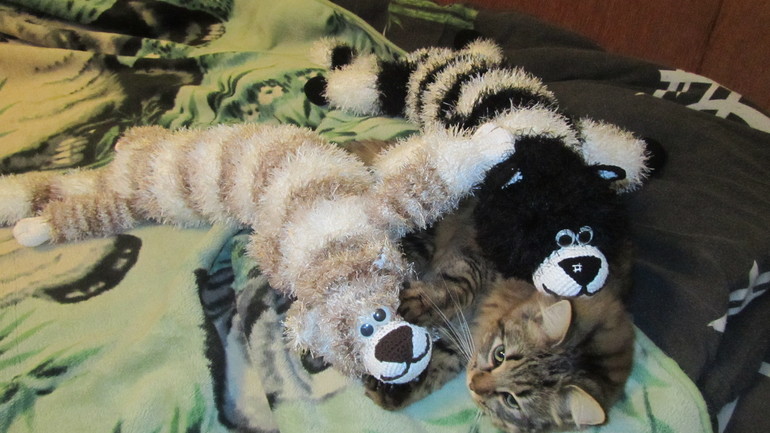 симпатичные котики))) хочу такого сыну, а то после одного неприятного случая он лишился своего зайки для сна (заяц к слову очень похож был на ваших котиков) проревел весь день((( продаете?