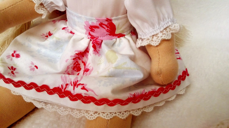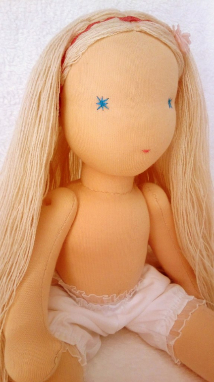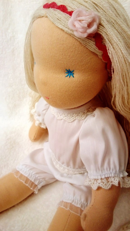 Куколка сшита полностью из натуральных материалов по традиционной вальдорфской технологии из хлопкового трикотажа, набивка - овечья шерсть, для волос используется шерстяная пряжа. Волосы вшиты равномерно по всей голове, их можно расчесывать и делать разные прически. Ручки и ножки двигаются свободно во все стороны . Одежда - панталончики, блуза, юбочка, кофточка и туфельки, все снимается.