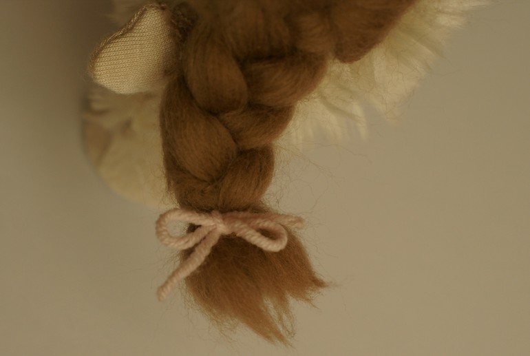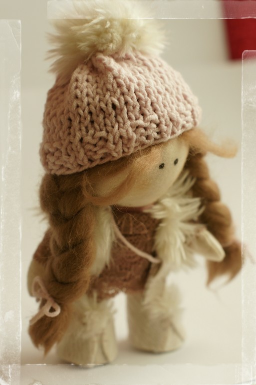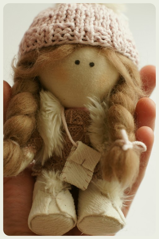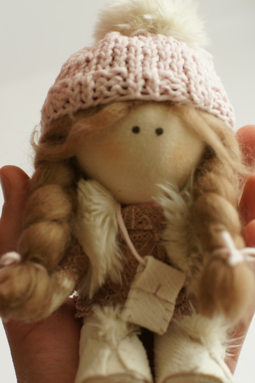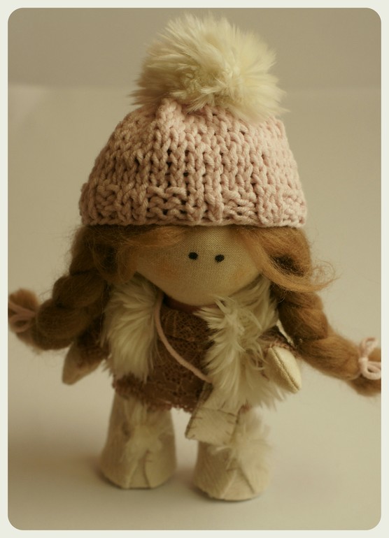О малышке- высота без шапочки 12 см. Тело выполнено из хлопка, обтянуто трикотажем. Трикотаж окрашен кофе. Набита синтепоном. Материал для волос - шерсть. В одежде использовался искусственный мех, итальянское кружево, атласная лента. Шапочка из пряжи холопок+акрил.