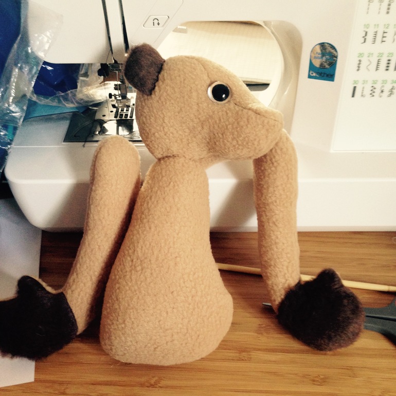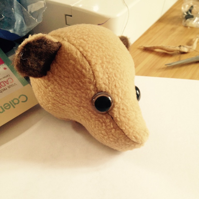Глазки вставлены в шов. На удачу в магазине, где всё для модельного хобби (для тех кто самолетики-корабли делает) обнаружила глазки. Они на ножке и с обратной стороны специальный зажим. Ушки вшиты не в шов, а потому использован просто потайной шов.