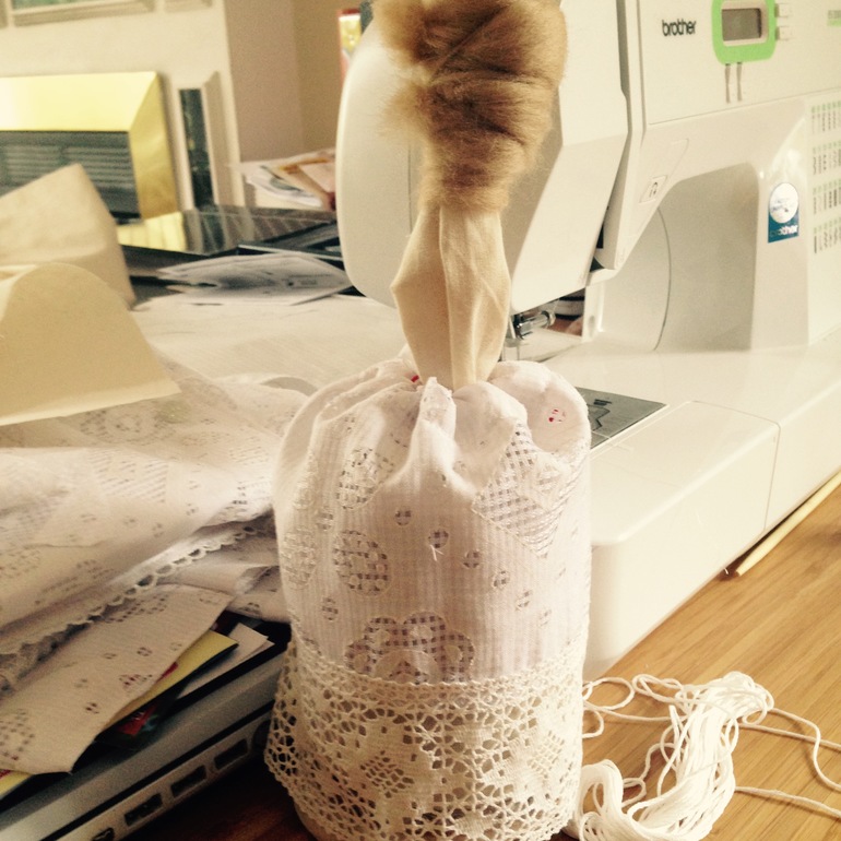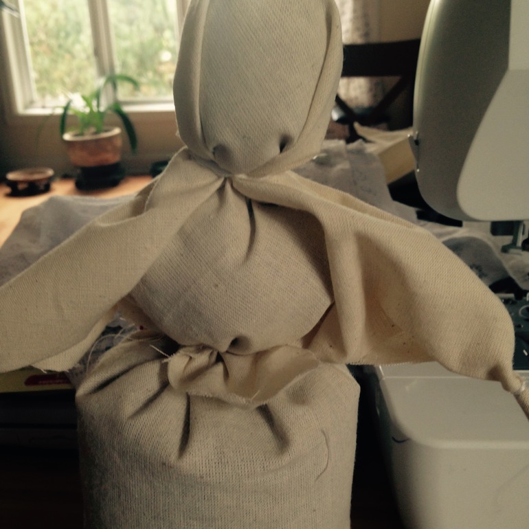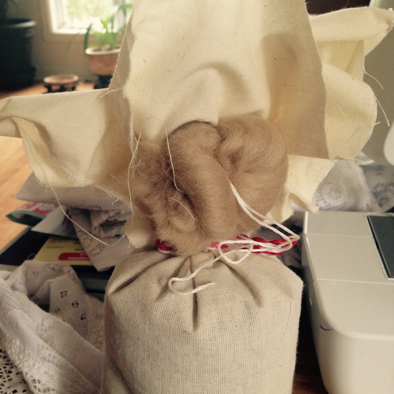 Верхнюю часть (будущая голова) обматываем шерстью. Поверх мешочка надеваем нижнюю юбку.
