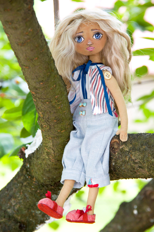 Может кто-то подумал что она скромняжка....ничего подобного, ребенок может иногда похулиганить и залезть на дерево, ведь оттуда виден целый мир. На девочке уже штанишки и жилеточка, на штанишках вышит малюююсенький кораблик, а еще есть шикарные пуговки.