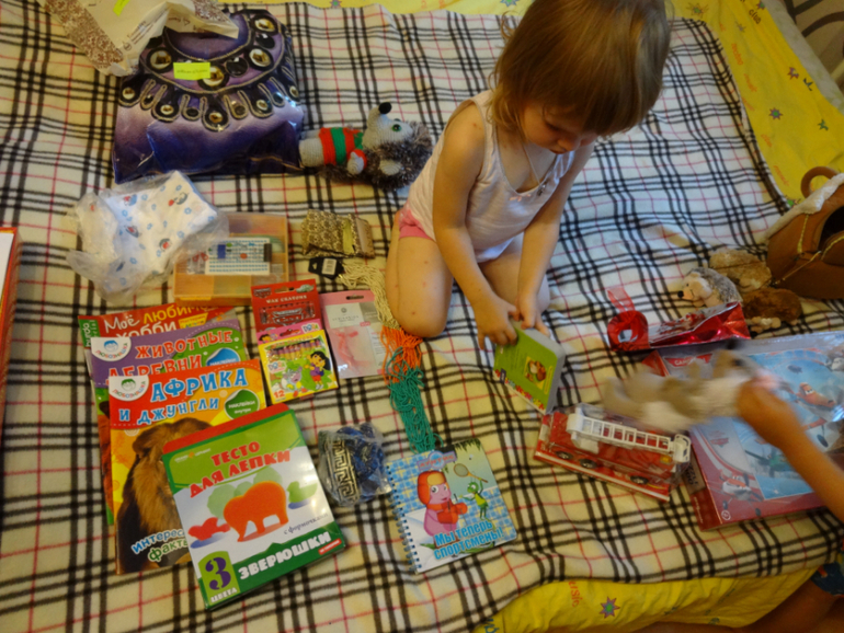 Подарков мы получили целую гору! И вот мои дрессированные драконы раздраконивают коробищу :) Забегая вперед скажу, что посылок было две - но про то будет отдельный пост :)