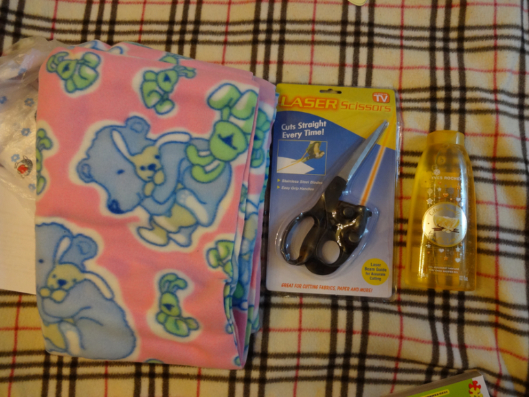 Подарки хомяку - ткань, флис, тесьма, подвесочки в коробочке, ленты атласные и совершенно чумовой гаджет - ножницы с лазерной указкой (почти с лазерным прицелом )))