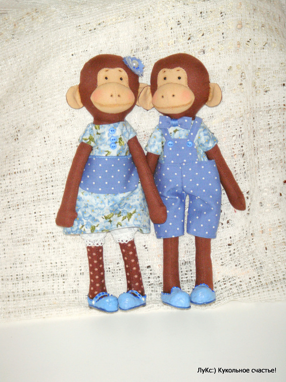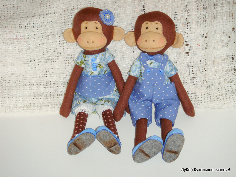 Прошлый этап закончился тем, что я сшила тушки двух обезьянок. Теперь самое время их одеть и украсить.