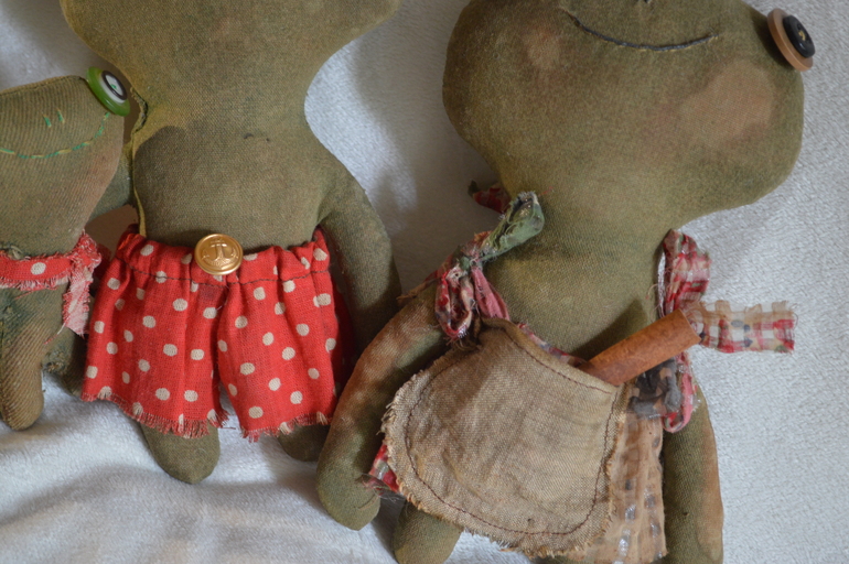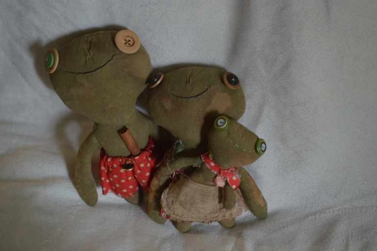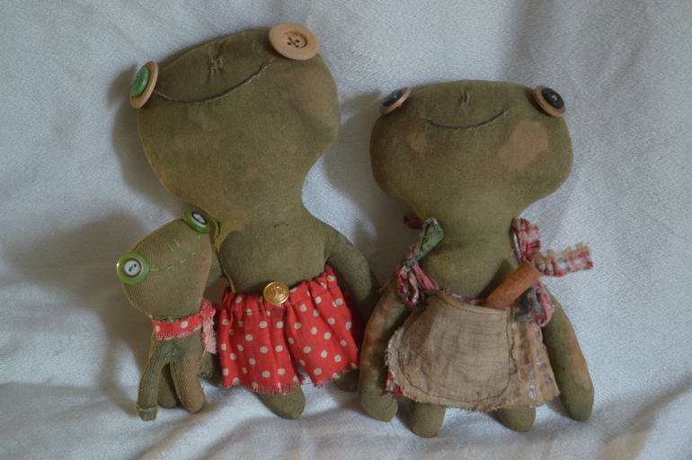 Текстильные куклы (кроме вальдорфских)Выношу на ваш суд кукол-примитивов (чердачных кукол), семейство лягушек, искусственно состарены, ароматизированы кофе, корице, папа с пуговицей из ссср времен, на пуговице якорь), мама в сарафанчике пэтчворк, носит сына-лягушенка то в кармашке сарафана, то дает ему свободу... заготовочек (в более человеческом обличьи анатомии тел ;))для таких кукол лежит много, только образ придумать и одеть пока никак не получается