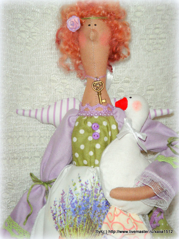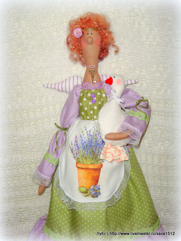 Сшита из итальянского и американского хлопка, набита синтепухом, прическа из шерстяных кудрей ручкого крашения, платье украшено кружевом, фартучек - декупажем) В руках гусик - символ уюта и достатка; на шее - ключик от счастья))