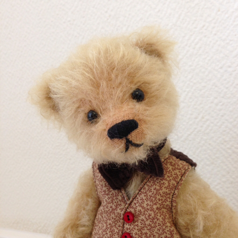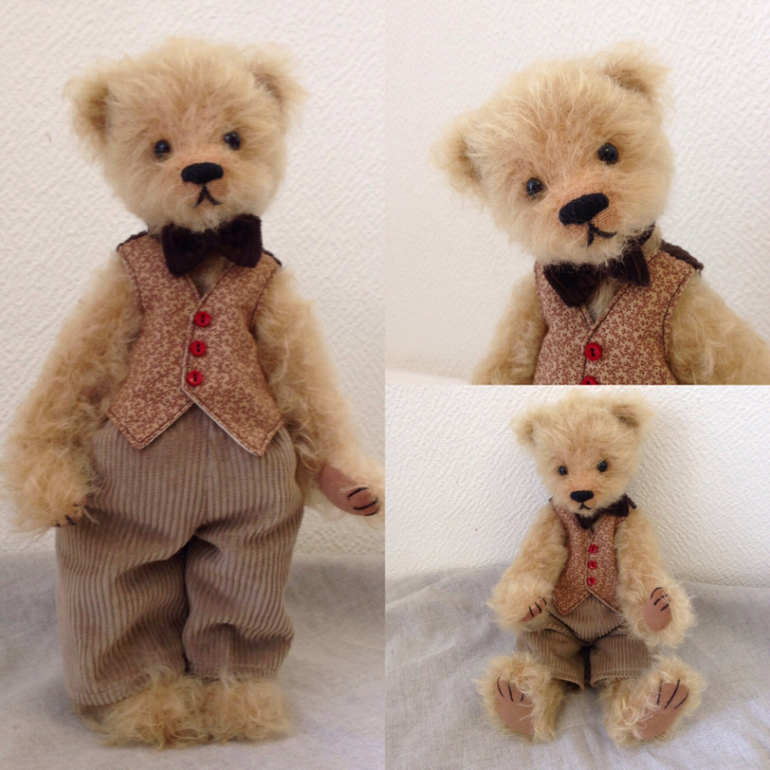 Медведик сшит из немецкого мохера, набит опилочками и стеклянным гранулянтом. Голова и лапки на шплинтах. Рост 30 см. В одежде использован вельвет, хлопок. Вся одежка снимается:)