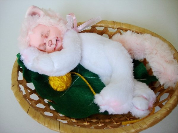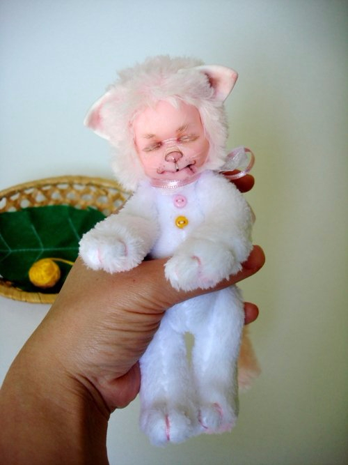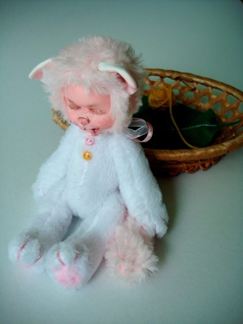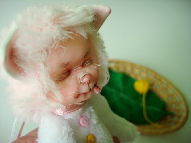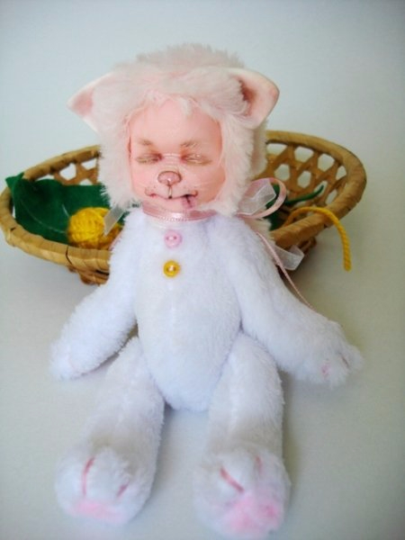 Куклы и игрушки из полимерной глины и других пластиков, а также из соленого тестаРост 18 см. лапы подвижны, утяжелен, на проволочном каркасе, конечности сгибаются. Мордочка, уши из пластика, раскрашен пастелью, акрилом, закреплено клиром и глянцевым лаком, есть реснички и шершавый язычок, корзина, коврик и клубок прилагаются. 3000 руб.