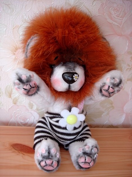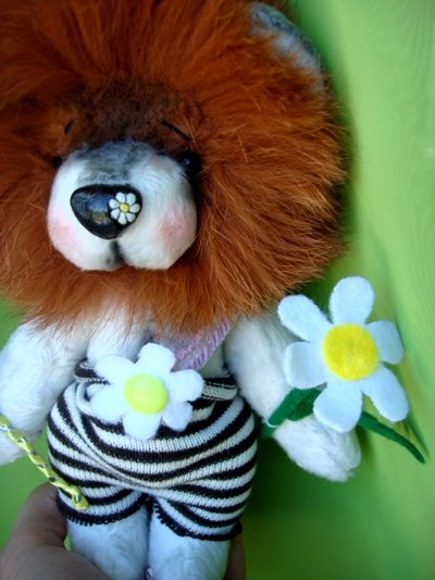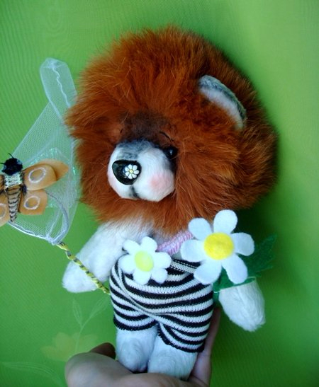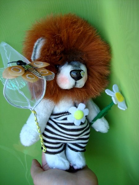 Рост 21 см. стоя, набит натуральной шерстью, утяжелен, лапки подвижны, умеет стоять и сидеть, носик, пяточки из пластики, голова из натурального меха, у малыша есть три ромашки, на носике, пуговка на штанишках и в лапке он держит цветочек, есть сачок, любит охотится на бабочек). Одежда и аксессуары снимаются.