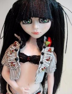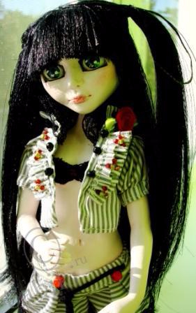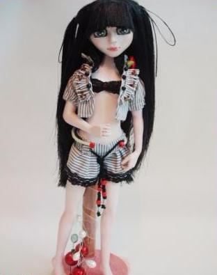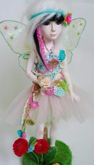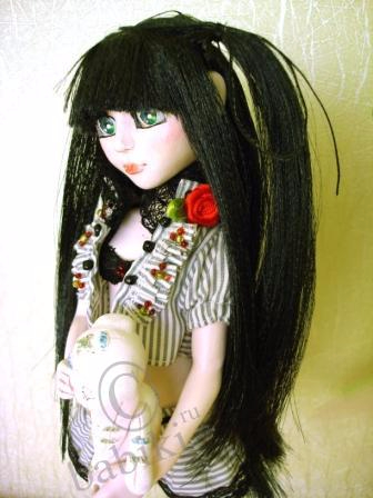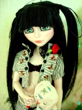 Высота 35 см. Выполнена из керамики, покрыта акриловыми красками, закреплена матовым лаком, руки ноги подвижны, с подставка снимается, волосы сделаны из иск. меха. Одежда снимается, кукла выполнена в единственном экземпляре. Больше фото сделаю если нужно.