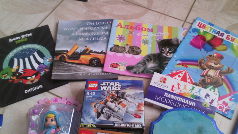 школьные нужности - отдельное спасибо за дневничок с птичками и альбом для Даши, пластилин уже в деле, за, что отдельное спасибо