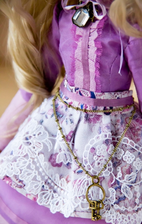 А еще у нее красивый фартучек из красивой ткани, итальянского кружева и шелковой ленточки. На поясе висит связка ключиков,один из которых из ее таинственного садика, о котором она расскажет только своей хозяйке.