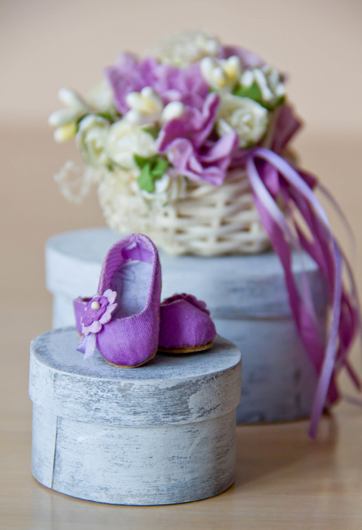 Туфельки у девочки тоже должны быть красивыми, вот и у Саши они в цвет платья,украшенные шелковой ленточкой и маленьким цветочком.