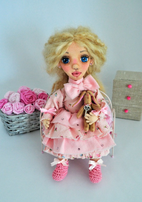 Продажа работ и предложения от рукодельницЗдравствуйте!!! Хочу предложить Вашему вниманию текстильную куколку Лилу и кролика Мими, которые ищут свой дом. Куколка и кролик сшиты из качественного трикотажа, глазки пластиковые собственного производства, лицо расписано акрилом и пастелью, ножки и ручки подвижны на шплинтовом креплении (внутри проволочный каркас), платье сшито из хлопка, волосики из овечьих кудряшек. Подставка прилагается. Цена 5000 р. + доставка. Отправляю почтой. Оформить заказ можно через мой магазин или лс http://vk.com/chastlivaya89