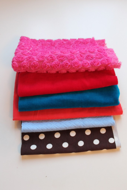 Сверху вниз: объёмные розы на сетке, велюр фуксия и ярко синий, микровельвет красный, хлопковый типа стеганый трикотаж, и просто трикотаж коричневого цвета в молочный горох.