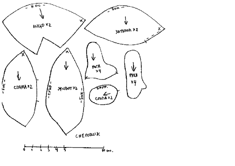Собственно выкройка, сделана на листе А4, сантиметровые деления для подгонки масштаба. Готовая игрушка у меня около 14 см. сидя, средний размер.