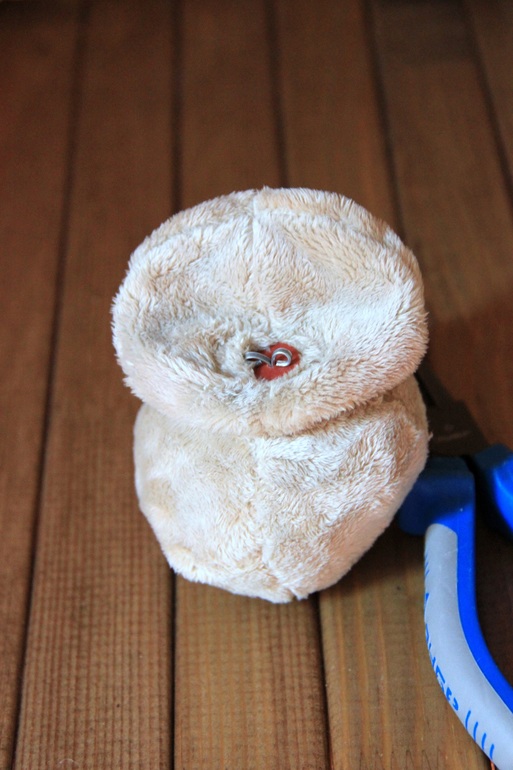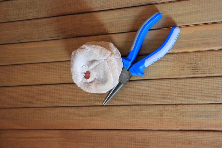 Этот штырь вставляем в верзушку туловища, в стык 4х швов. Через отверстие для выворачивания на туловище надеваем на шплинт второй диск (такого же диаметра), расправляем ткань, чтобы между дисками не было лишних заломов и складок. Прижимаем одной рукой, другой берем круглогубцы (у меня они большеваты честно говоря, надо бы поменьше, ювелирные вроде бывают) и крутим "барашки". Закручиваем усы так, чтобы они прижимали один диск к другому очень плотно, насколько возможно.