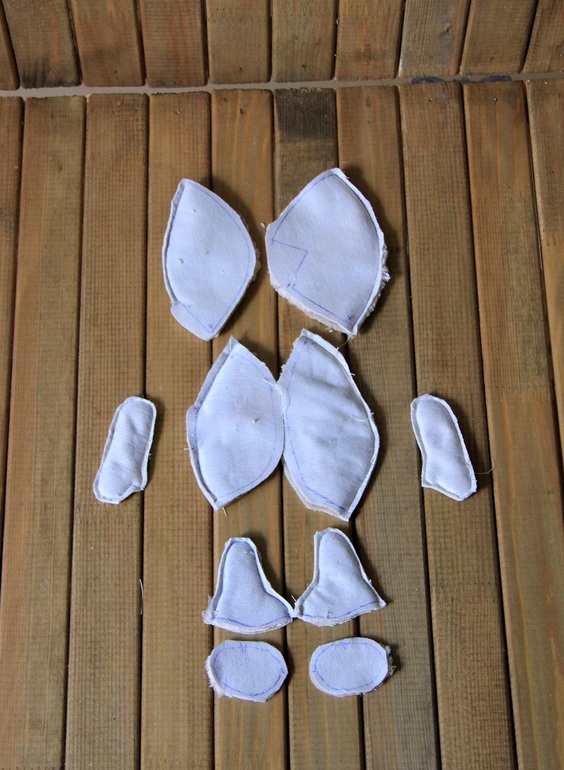 Переносим детали выкройки ручкой на изнанку ткани. Пузо, спинка, затылок, лицо, 2 руки и 2 ноги (стопы пока не трогаем). Закалываем булавками.Чтобы облегчить себе труд, предлагаю прострочить на машинке: 2 части туловища (бока не строчим), руки по кругу, ноги кроме стоп, затылок - оставляя незашитым отверстие для выворачивания головы. Лицо тоже строчим с одной стороны (не там, где вытачка).
