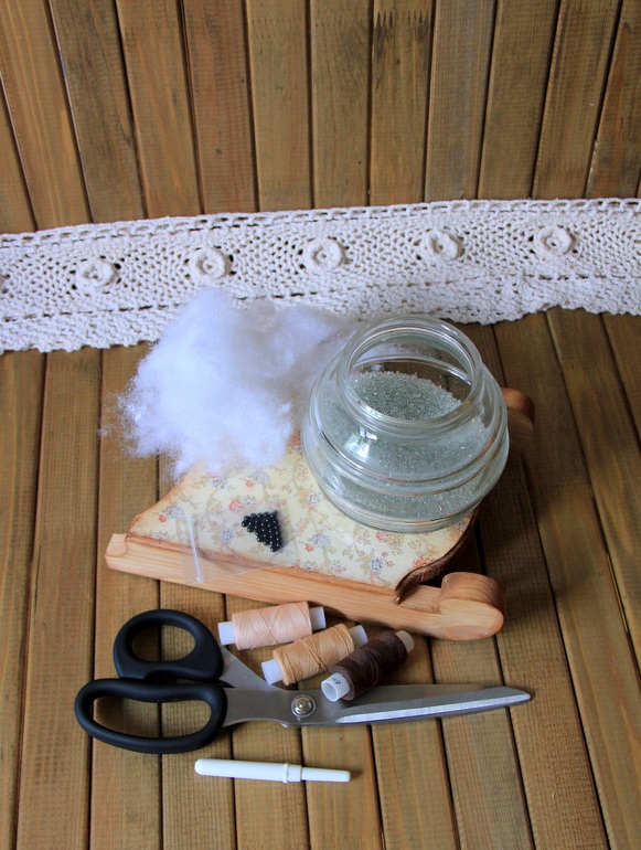 Еще понадобятся нитки в цвет основы (у меня лен), для ручного сшивания деталей, распарыватель, гранулят (у меня стеклянный), наполнитель - синтепух или холлофайбер. Можно и синтепон, но надо будет его мелко рвать и избегать комков при набивке.