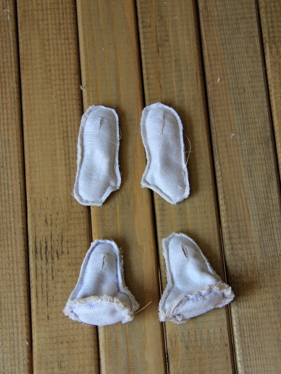 К ножкам пришиваем стопы, нужно как-то отметить, где внутр. сторона стопы - с этой стороны будет прорезь на бедре для выворачивания. Внутр. часть стопы отмечена на выкройке.