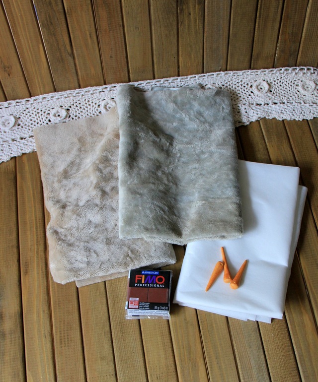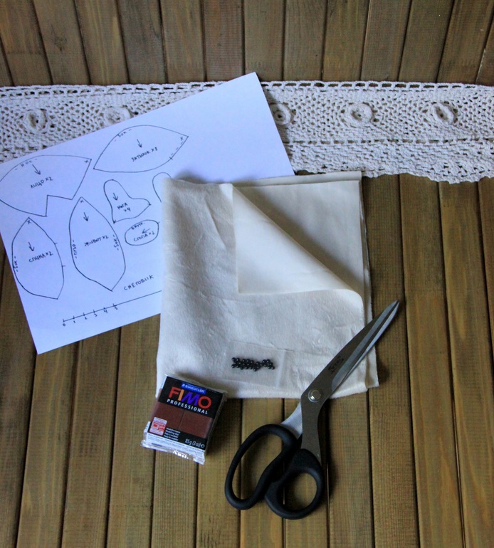 Еще материалы - аналог плюша - микрофибра (мелковорсный синтетический мех на плотной основе). Глазки-бусинки, мои любимые икеевские ножницы.